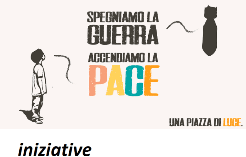 Bologna manifestazione ‘Spegniamo la guerra, accendiamo la pace’ Piazza Nettuno, dalle ore 10 alle 13 Contatto: Vittorio Pallotti CMDPI (vittoriopallotti@libero.it) Promotori: ACLI-Circolo Giovanni XXIII, Centro di Documentazione del Manifesto Pacifista Internazionale, CDMPI,Donne in Nero, Emergency, Legambiente, Pax Christi,Percorsi di Pace Brescia Fiaccolata della Pace – Ore 20.15 Centro Civico in Via Farfengo, 69 – arrivo al teatro dell’oratorio di Fiumicello. A conclusione incontro con: Don Fabio Corazzina parroco di Fiumicello, Giacomo Morandi Vice Presidente della Rete Civica Bresciana e un rappresentante della Comunità Musulmana contatto: Andrea Franchini (andrea.franchini@aclibresciane.it)