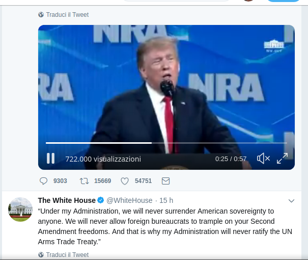 Il presidente degli Stati Uniti Donald Trump ha dichiarato che ritirerà il suo paese dal trattato internazionale sul commercio di armi (Arms Trade Treaty o ATT), firmato da Barack Obama nel 2013, e che intende regolamentare la vendita di armi tra Paesi. Lo ha detto alla convention annuale dell’American National Rifle Association (Nra) secondo cui il trattato è una minaccia per il secondo emendamento che regola il diritto americano di portare armi. Trump ha detto che chiederà al Senato degli Stati Uniti di non ratificare il patto.