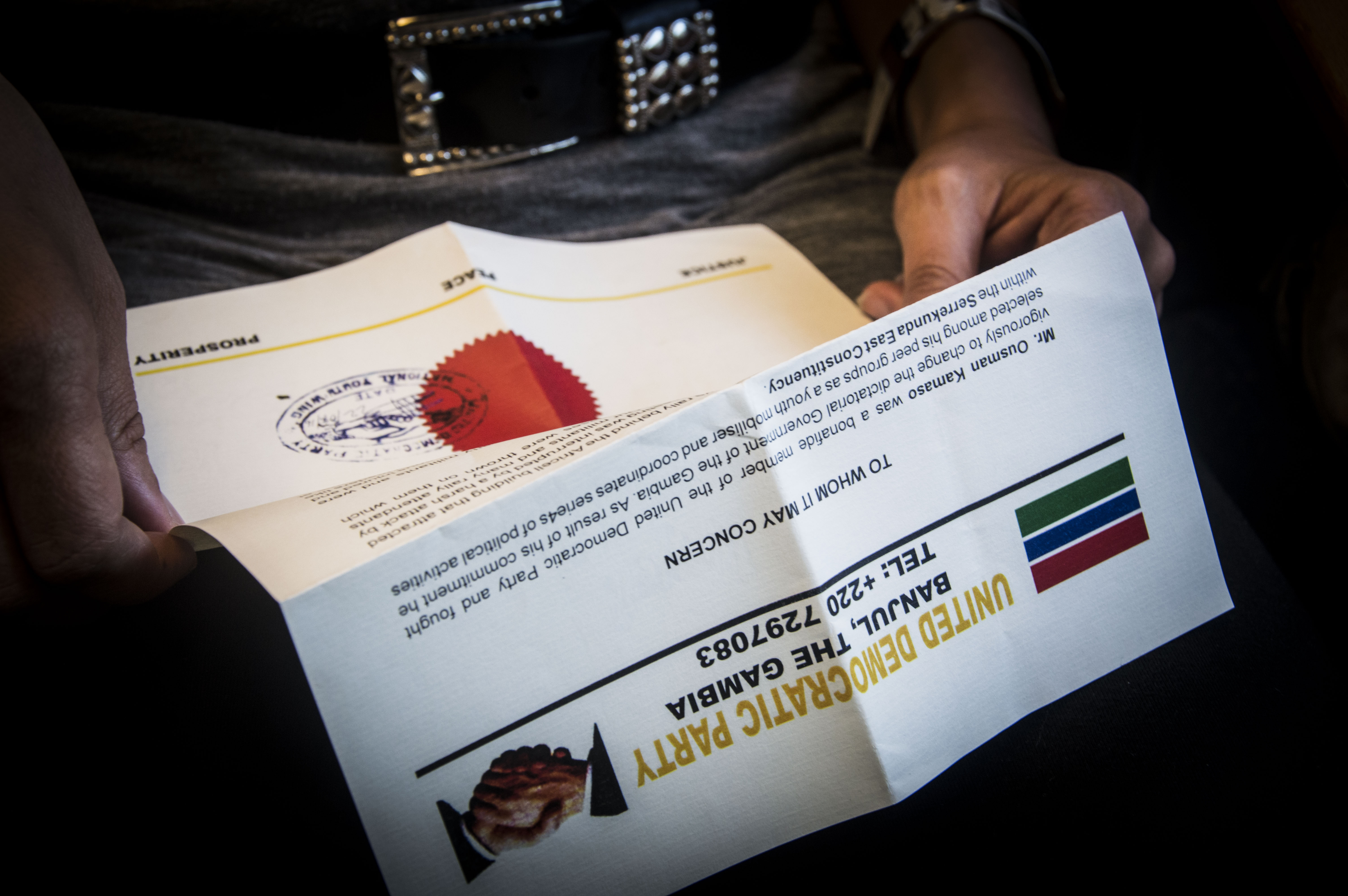 Il nostro viaggio-missione ci ha portati a Sukuta, città a sud di Banjul. Qui tramite la moglie di Mohamed, Fatima, siamo riusciti a ottenere la sua tessera di iscrizione al partito e la dichiarazione di quanto Mohamed aveva sempre raccontato, scritta da uno degli esponenti dell’Udp. Nella lettera sta infatti il motivo della fuga, il racconto di quella manifestazione del novembre 2011 durante la quale perse il portafoglio, di quando la polizia venne a cercarlo a casa e non lo trovò solo perché la moglie lo aveva chiamato per avvertirlo di non tornare.