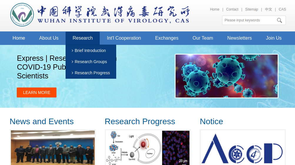 In copertina la home page del Wuhan Institute of Virology, Chinese Academy of Sciences
