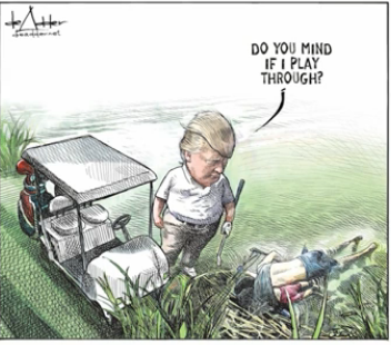 L’illustrazione di un fumettista canadese che ha ritratto il presidente Donald Trump che giocava a golf sui corpi di due migranti annegati è diventata virale sui social ma due giorni dopo, Michael de Adder ha dichiarato su Twitter di essere stato messo alla porta da una casa editrice di New Brunswick, in Canada, scrive Cnn..