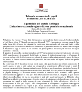 Il lavoro di raccolta di informazioni, testimonianze, prove che ha portato nel settembre del 2017 il Tribunale Permanente dei Popoli (Tpp) a emettere una sentenza di genocidio e crimini di Stato perpetrati a danno di Rohingya, Kachin e altre minoranze birmane, finirà nei faldoni della Corte penale internazionale dell’Aja (Cpi). Un’organizzazione della società civile che per mesi ha raccolto le prove dei crimini birmani intende adesso passare alla Cpi tutti i materiali che furono presentati alla sessione internazionale di Kuala Lumpur nell’autunno dell’anno scorso: materiali che potrebbero integrare il lavoro dei magistrati che, da qualche mese, stanno valutando la possibile incriminazione di chi organizzò e mise in opera una “deportazione” di massa in Bangladesh che, in soli due mesi nel 2017, ha fatto fuggire dal Myanmar oltre 700mila persone. La decisione è stata resa nota ieri a Roma durante una Conferenza organizzata dal Tpp e dalla Fondazione Basso dedicata ai Rohingya nel 70mo anniversario della Dichiarazione universale dei diritti dell’Uomo. Una carta che il Myanmar, allora Birmania, fu tra i primi Stati membri dell’Onu a firmare.
