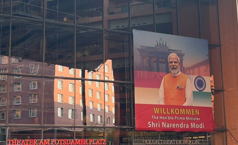 Nell’immagine, gigantografia di benvenuto a Berlino di Modi; foto di Ludovica Sacchi.Nel testo, Modi a Berlino