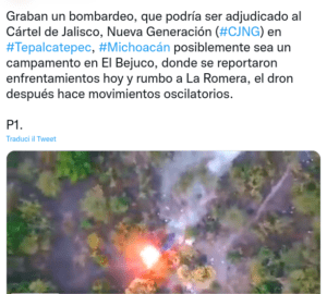 Da qualche giorno, sui profili social messicani gira un video diventato ormai virale. Dura 2 minuti e 20 secondi. È la ripresa aerea della videocamera di un drone che mostra un’esplosione, poi degli ordigni incendiari che fanno divampare immediatamente le fiamme nella foresta e infine tanto fumo. Ma soprattutto, fin dall’inizio, in quei fotogrammi si vedono numerose persone che scappano come meglio possono da delle baracche e capanne di fortuna coperte da un telo blu. L’attacco, avvenuto lunedì 10 gennaio, è stato attribuito al cartello della droga Jalisco Nuova Generazione (Cjng), che per tutta la settimana precedente aveva avviato una campagna di analoghi bombardamenti sulle baraccopoli nel comune messicano di Tepalcatepec, nello stato del Michoacán, con l’obiettivo di prenderne il controllo. Il tutto, dopo una serie di scontri a fuoco con le unità di autodifesa, presenti in quei villaggi proprio per cercare di difendere la popolazione dallo strapotere dei narcos. Contendendosi ogni singolo centimetro di territorio.