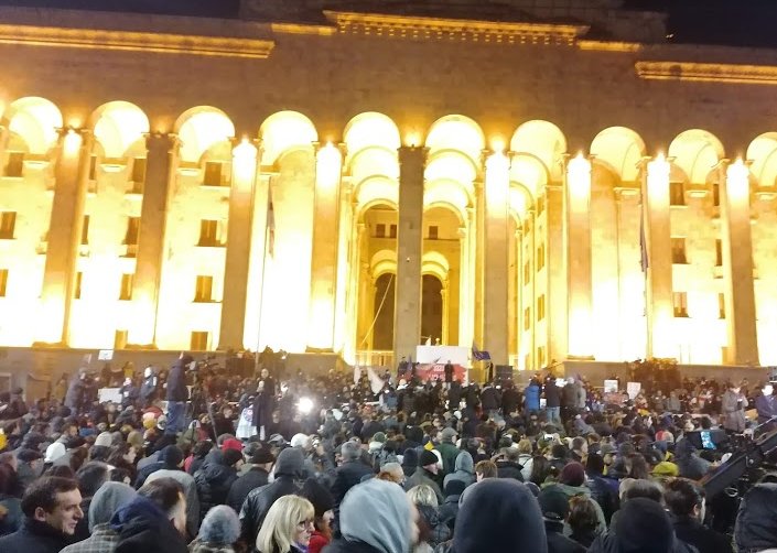 In migliaia hanno preso parte alle proteste avvenute lunedi sera di fronte al Parlamento, dove vari rappresentanti dei partiti d’opposizione sono intervenuti e Rustaveli, una tra le vie principali della capitale, è stata nuovamente bloccata. I discorsi pieni di rabbia sono durati fino a tarda serata ed in centinaia si sono accampati, come la volta precedente, intorno al Parlamento con lo scopo di bloccarne l’ingresso.
