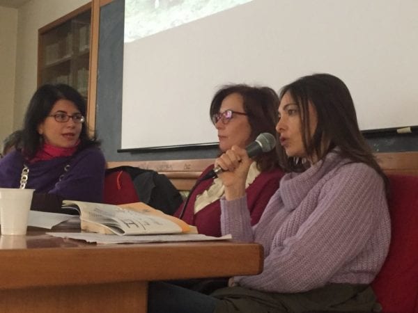 Nella foto Valentina Ripa (Festival del Cinema dei diritti umani di Napoli), Maria Rosaria Ruggiero (vedova di Fabio Maniscalco) e Laura Sudiro (coautrice di Oro Dentro)
