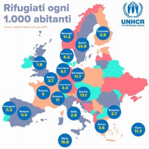 La mappa dell’alto commissariato dell’Onu illustra la presenza di rifugiati per abitante nel continente europeo