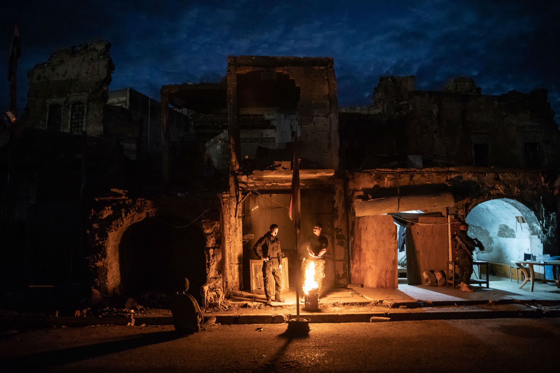 FOTO 15 - Iraq, Mosul, novembre 2018. Nella parte vecchia di Mosul un posto di blocco della polizia locale. I soldati si scaldano intorno al fuoco. Ci sono ancora cellule silenti di Daesh in città.