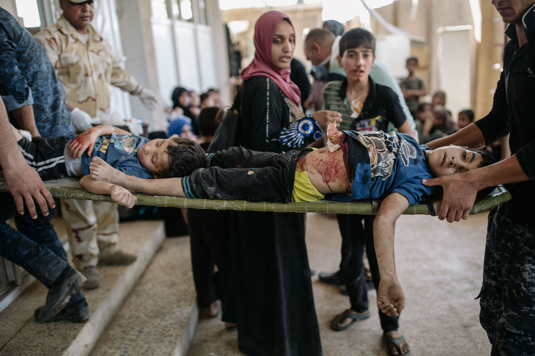 FOTO 3 – Mosul Ovest, 3 giugno 2017. Clinica di emergenza della nona divisione corazzata dell'esercito iracheno. Civili feriti stanno accorrendo alla clinica dopo essere fuggiti dai territori controllati da Daesh. Molti civili sono feriti. Qui arrivano due bambini gravemente feriti. La loro condizione è critica.