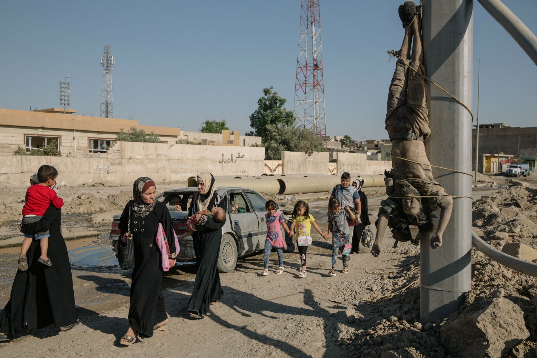 FOTO 4 - Il 26 giugno 2017, il corpo di un jihadista viene appeso a un palo in un trafficato crocevia della città. La notte prima, le cellule dormienti dell'Isis hanno effettuato vari contrattacchi nei quartieri liberati di Mosul Ovest. L'esercito iracheno ha impiccato il corpo di uno dei jihadisti per umiliare il nemico e spaventare le altre cellule dormienti nascoste in città.
