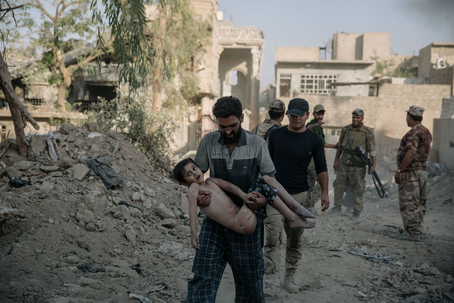 FOTO 9 – Mosul Ovest 5 luglio 2017. Uomini e donne fuggono dai combattimenti nella città vecchia. Un uomo e suo figlio ferito si trovano sulle rive del Tigri e si dirigono verso la nona divisione dell'esercito iracheno. L'esercito controlla ogni uomo che lascia il territorio detenuto da Daesh. In caso di dubbio, l'uomo viene ucciso immediatamente e gettato nel Tigri.