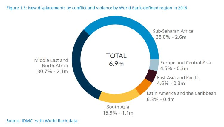 Complessivamente, sommando i nuovi sfollati con quelli che lo erano già a inizio 2016, a fine 2016 le persone nel mondo obbligate a stare fuori di casa – sfollate o rifugiate – a causa di un conflitto in corso erano 40,3 milioni.
