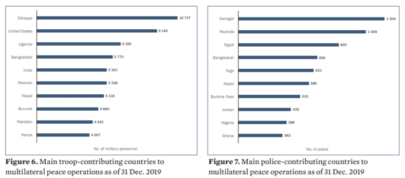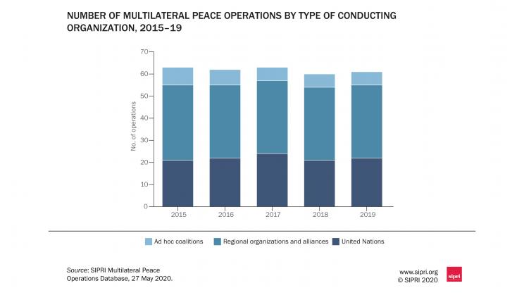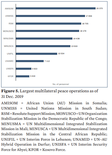 Tagli ai bilanci hanno continuato a incidere sull’impronta delle operazioni di mantenimento della pace delle Nazioni Unite nel 2019. Nel periodo 2015-2019, comunque, il numero totale di operazioni di pace multilaterali attuate dalle Nazioni Unite, che oltre alle operazioni di mantenimento della pace comprende anche un numero di minori missioni politiche speciali, è rimasta relativamente stabile, intorno alle 22. E’ invece diminuito il numero di operazioni multilaterali di pace condotte da coalizioni ad hoc, mentre il numero di operazioni svolte dalle organizzazioni regionali è aumentato.