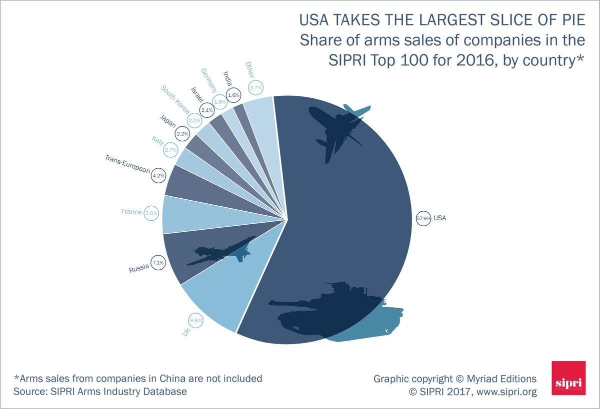 Per quanto riguarda le vendite a capo della classifica ci sono ancora una volta Stati Uniti, Russia, Cina, Francia e Germania, che hanno contribuito il 74 per cento delle esportazioni totali. Usa e Russia, da soli, hanno raggiunto il 56 per cento.