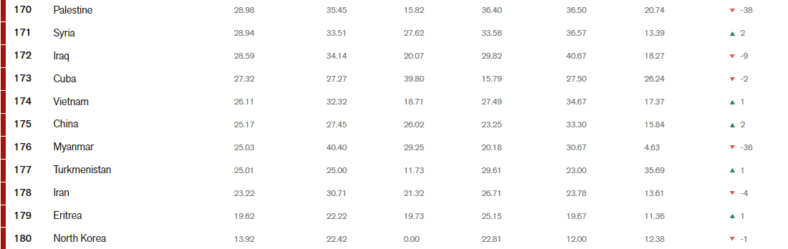 Reporter senza frontiere rileva ad esempio come l’invasione dell’Ucraina (106° posto in classifica) da parte della Russia (155°) riflette questo processo, poiché il conflitto armato è stato preceduto da una guerra di propaganda. Anche in Medio Oriente la mancanza di libertà di stampa continua ad avere un impatto sul conflitto tra Israele (al 86° posto), Palestina (170°) e gli stati arabi.