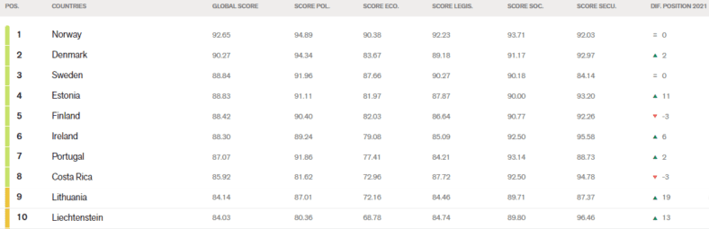 Ancora una volta la testa della classifica è occupata dal trio Norvegia, Danimarca e Svezia.