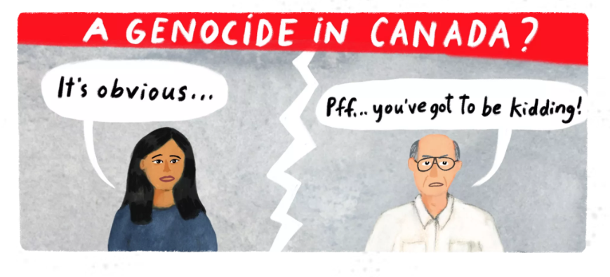 L’Associazione delle Donne Native del Canada (Nwac) è un’organizzazione indigena che dà voce alle ragazze, le donne e le persone gender-diverse di origine indigena. Oltre che verso gli insegnanti l’attenzione della Nwac, nata nel 1974 dall’unione di 12 associazioni provinciali e territoriali, si rivolge oggi al governo, chiedendo di “includere la vera storia del Canada nei programmi delle scuole superiori”. “Teach the Genocidio!” racconta, attraverso un percorso didattico per immagini, come, “gli indigeni venivano sistematicamente assassinati, feriti, sterilizzati e derubati con l’intento di distruggere le comunità”.