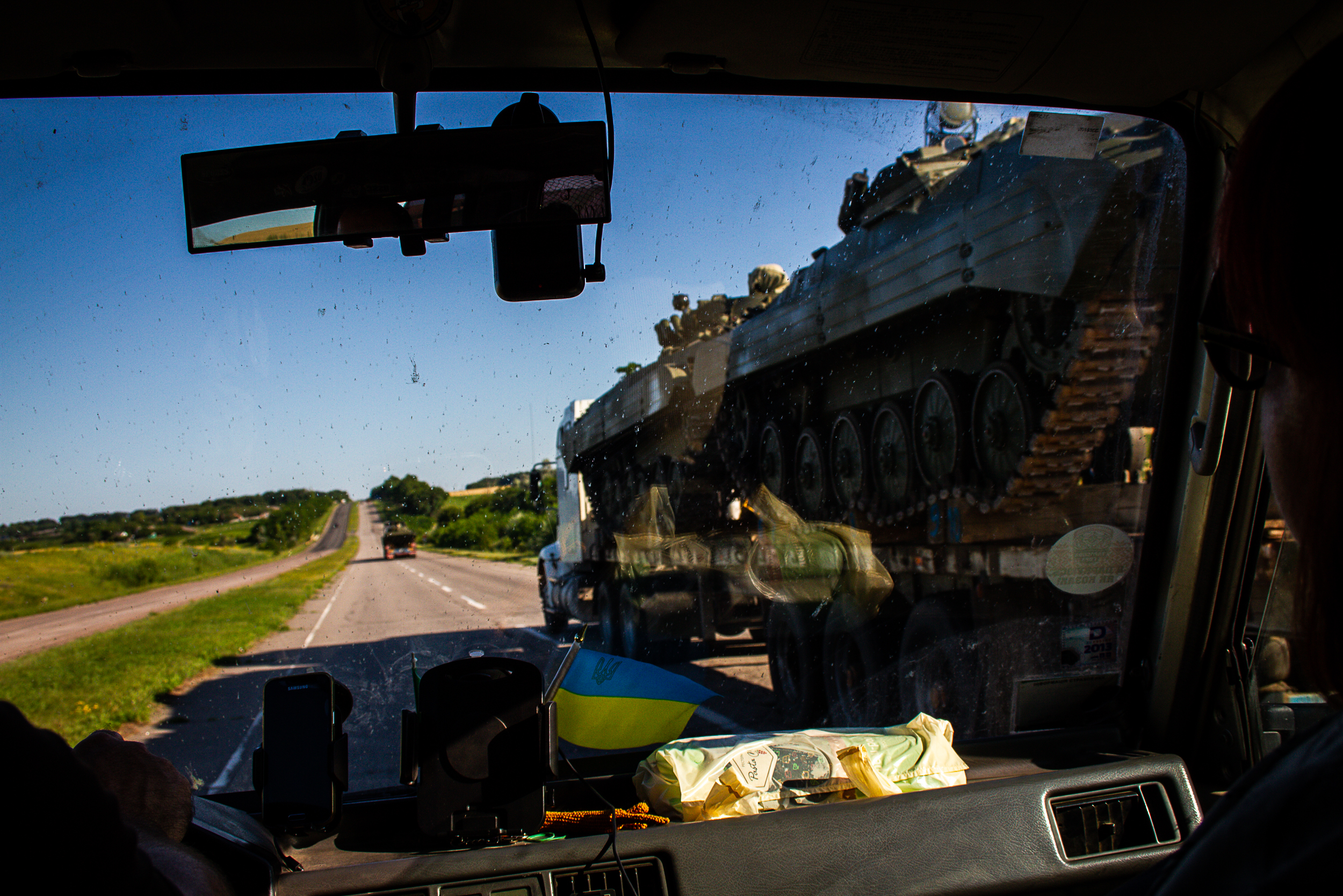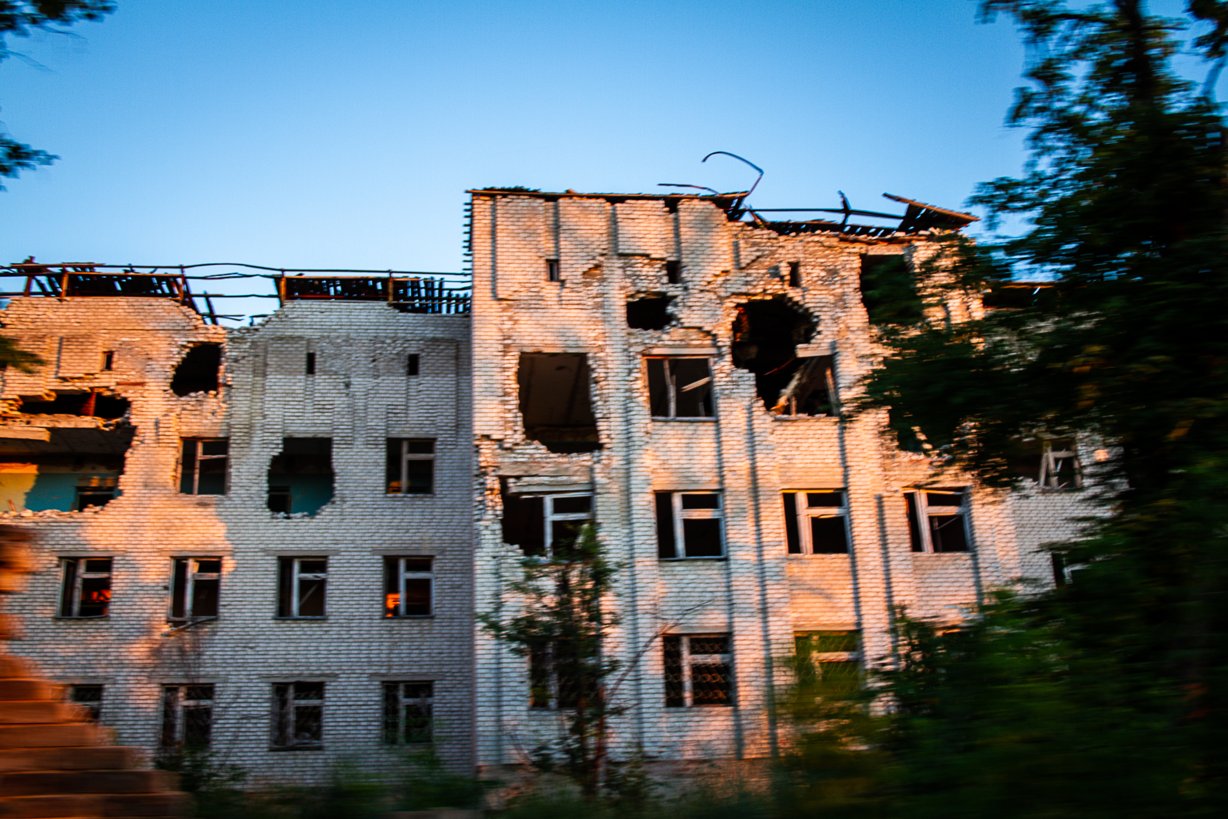 Andrij e Victoria, due volontari della Croce Rossa e sostenitori del primigenio dissenso, caricano barelle, medicinali, flebo e sacchi di riso a bordi di un furgoncino. Lasciamo Kharkiv in tarda mattinata. Per due ore procediamo in aperta campagna, seguendo un serpente d’asfalto assediato dai campi di grano. Odore di zuppe riscaldate e cavolfiori. Tre carri armati sostano lungo la statale, anticipando il primo Check Point militare. Il kalashnikov è onnipresente, la poca voglia di guardarsi in faccia pure. Corrono tempi duri. Donando sempre qualcosa (un rasoio, una saponetta, un pacchetto di sigarette per le guardie più severe), superiamo quattro avamposti prima di raggiungere Sloviansk. Gli edifici giacciono vuoti, crivellati dai proiettili; i tetti sfondati accolgono la pioggia. “Dobbiamo muoverci in fretta – sentenzia Andrij – dopo il tramonto entra in vigore una sorta di coprifuoco. Seppur improbabile, c’è sempre il rischio di incappare in qualche cecchino o banda armata”. Dalle mura pericolanti dell’ospedale civile fuoriescono assi marce e involucri di sale operatorie. La struttura dava soccorso a 500 sfollati in fuga dalla linea di fuoco. Nessuno sa che fine abbiano fatto. Al tramonto, ringalluzzito dall’alcool, Andrij tenta l’arrembaggio puntando l’AK-47 (scarico) contro un barattolo di fagioli. Lasciamo alle spalle i sacchi di sabbia ridotti a colabrodo. Di cecchini nemmeno l’ombra. Kharkiv.