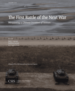 Secondo gli esperti americani, la Cina comincerebbe il suo attacco distruggendo la marina e l’aeronautica di Taiwan sin dalle prime ore dell’attacco. Poi la marina cinese circonderebbe l’isola contesa mentre decine di migliaia di soldati attraverserebbero lo stretto di Taiwan sia con mezzi navali sia con truppe aviotrasportate. The First Battle of the Next War / Wargaming a Chinese Invasion of Taiwan (di cui riproduciamo la copertina) sostiene dunque che Taiwan deve resistere e non capitolare